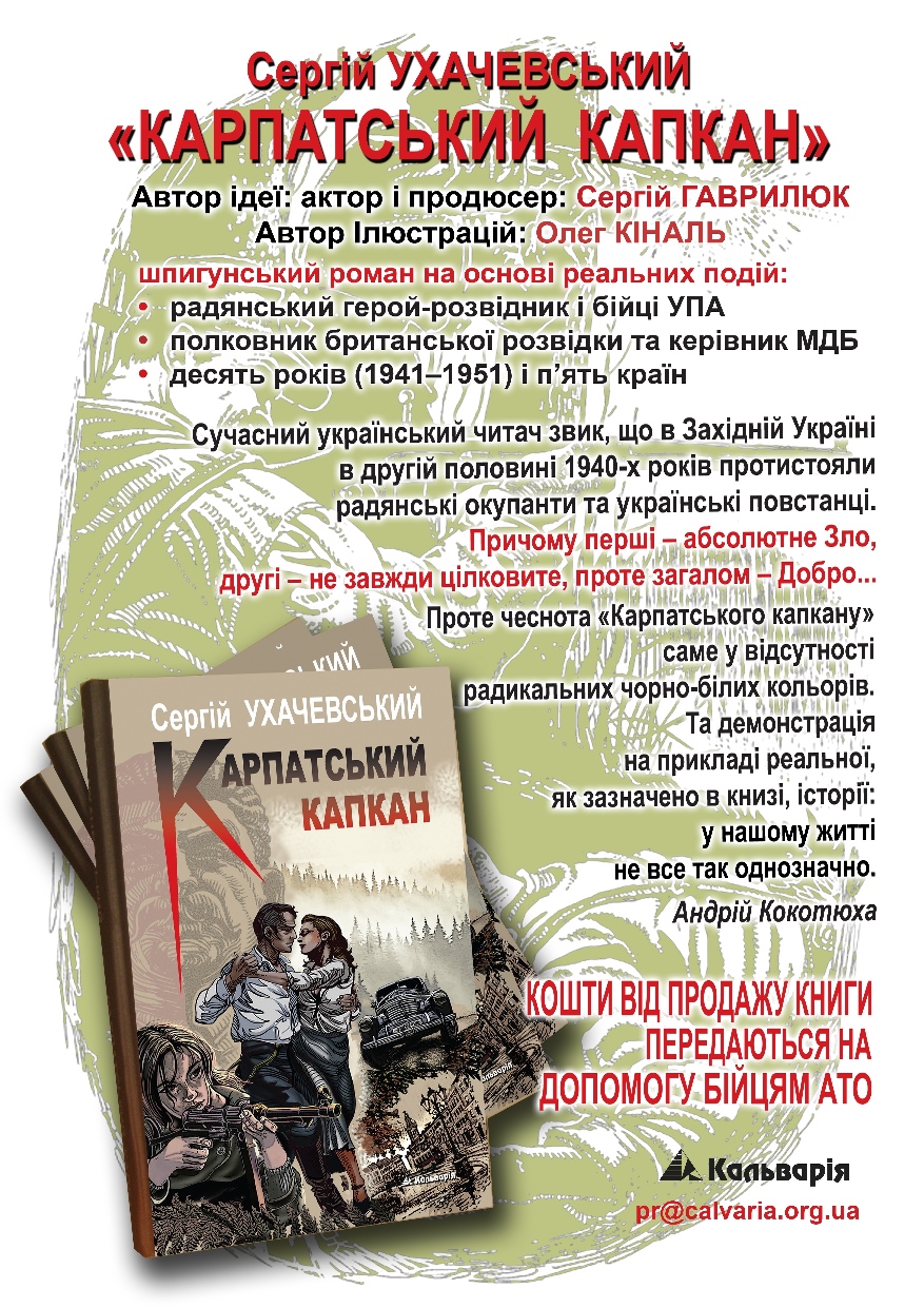 ![]() ![]() ![]() | Сергій УхачевськийКарпатський капканISBN: 9789666633470Класифікатор: Українська художня література. Проза К-сть сторінок: 216 Кошти від продажу цієї книги передаються на допомогу бійцям АТО ТОП-7 новинок за версією видання «Домашний очаг» ТОП-15 бестселерів весни книгарні Криївка бестселер весни магазину електронного контенту BookLand ТОП-10 кращих книг 2015 року порталу Фраза.UA Сім романів, що допоможуть цікаво провести вечір від Intermarium Top-7 кращих романів за версією First Truth&Transparency Committee (FTTC) Придбати електронну книгу або читати в форматі мобільного контенту: у магазині ліцензійного контенту Bookland в електронній бібліотеці "Магазин розумного контенту" від Київстар Це — розповідь про реальні події, що охоплює десять років (1941–1951) і п’ять країн, учасники якої — радянський герой-розвідник і воїни УПА; Йосип Сталін і Лаврентій Берія; фотокореспондент французької газети «Юманіте» і веселий білоруський партизан; 2-й Міністр Державної безпеки СРСР і Прем’єр-міністр Великобританії; чарівна агентка британської військової розвідки Бестія і безіменний Курвамать... Невдала спецоперація Кремля на території Галичини в повоєнні роки, яка збіглася у часі з кількома іншими подіями, не залежними від радянського уряду. А на «перетині інтересів» урядів кількох країн опиняється директор дитячого сиротинця для глухонімих — професійний розвідник, доля якого видається абсолютно неймовірною саме тому, що вона є справжньою — у головного персонажа роману є реальний прототип. Андрій Кокотюха, письменник, журналіст: Сучасний український читач звик, що в Західній Україні в другій половині 1940-х років протистояли радянські окупанти та українські повстанці. Причому перші – абсолютне Зло, другі – не завжди цілковите, проте загалом – Добро... Проте чеснота «Карпатського капкану» саме у відсутності радикальних чорно-білих кольорів. Та демонстрація на прикладі реальної, як зазначено в книзі, історії: у нашому житті не все так однозначно. «Ідея роману народилася після розповіді Сергія Гаврилюка (син актора Івана Гаврилюка — прим. ред.) про свого діда по матері, який був розвідником. — говорить письменник Сергій Ухачевський. — Довелось попрацювати і з архівами. Але варто не забувати, що це — не історична хроніка, а художній твір, і певна доля фантазії в ньому є». Книга ілюстрована в стилі 60-х-70-х років минулого століття. Малюнки створив відомий ілюстратор Олег Кіналь, а дизайн обкладинки та макет книги — знаний львівський художник Михайло Євшин. А такі деталі, як книжковий папір і тверда палітурка з півкруглим корінцем, роблять цю книгу не лише цікавим читанням, але й чудовим подарунком. При чому, як дорослому читачу, так і підлітку. «Тексти Сергія Ухачевського завжди дуже «живі», насичені, динамічні. Ти не встигаєш перевести подих, як історія вже підходить до фіналу. — відзначає керівник і власник видавництва «Кальварія» Петро Мацкевич. — А його бойовий досвід вберігає читача від «військових ляпів», які регулярно трапляються у письменників». Facebook-сторінка книги |
