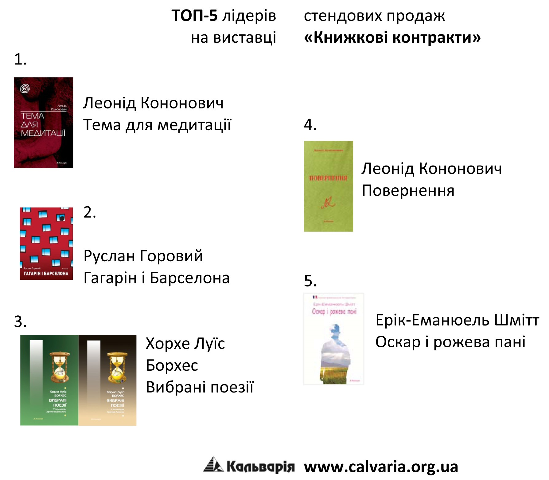 За підсумками участі Видавництва Кальварія у V-й Київській міжнародній книжковій виставці «Книжкові контракти», яка відбулася 11-13 грудня в Українському домі (Київ) лідерами продажів стали такі книжки:1. Леонід Кононович. Тема для медитації