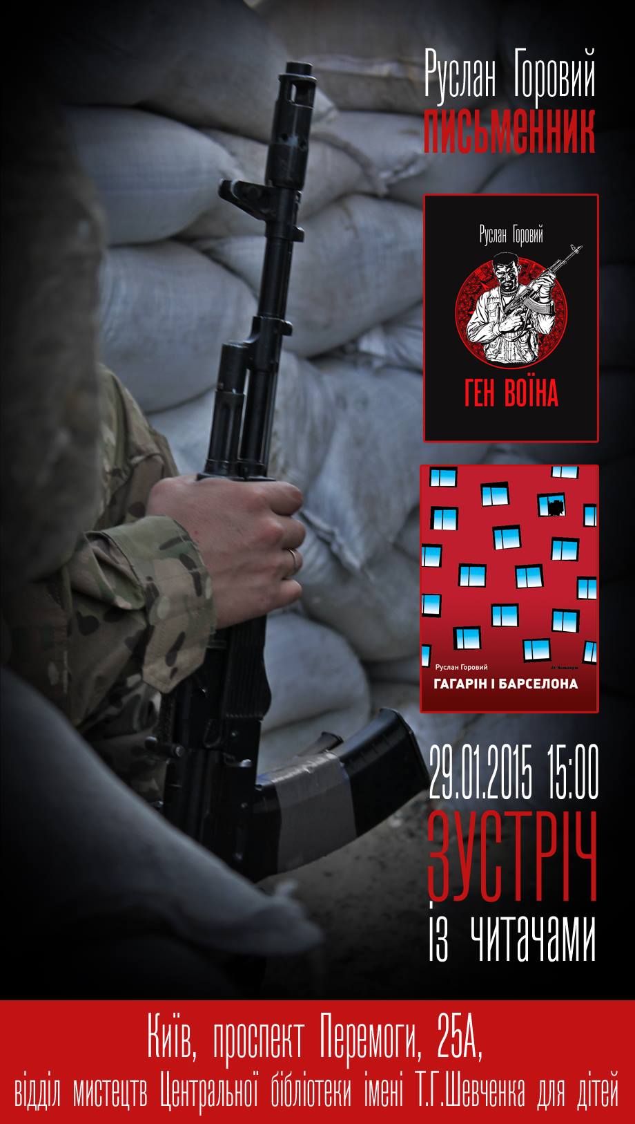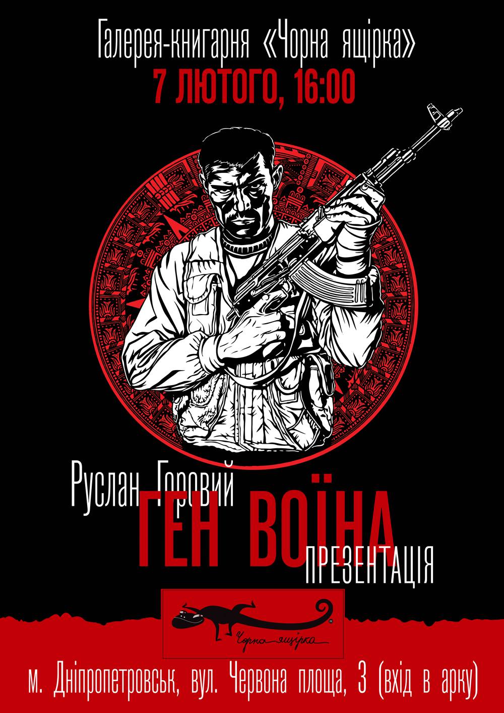 7 лютого, в суботу, Руслан Горовий зі своїм «Геном воїна» та Петро Мацкевич завітають до дніпропетровської галереї-книгарні «Чорна ящірка».