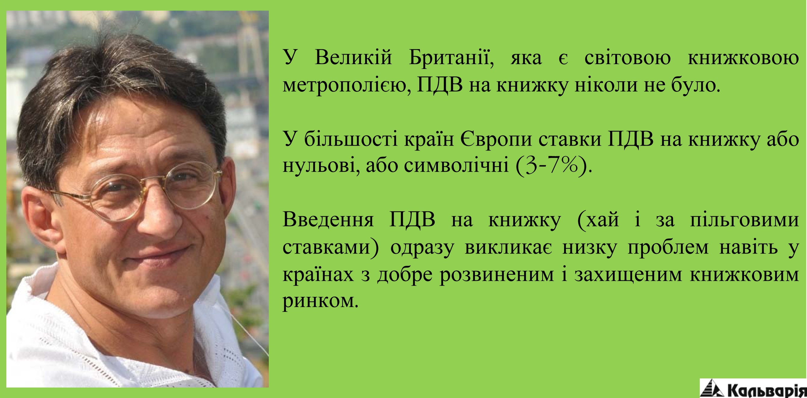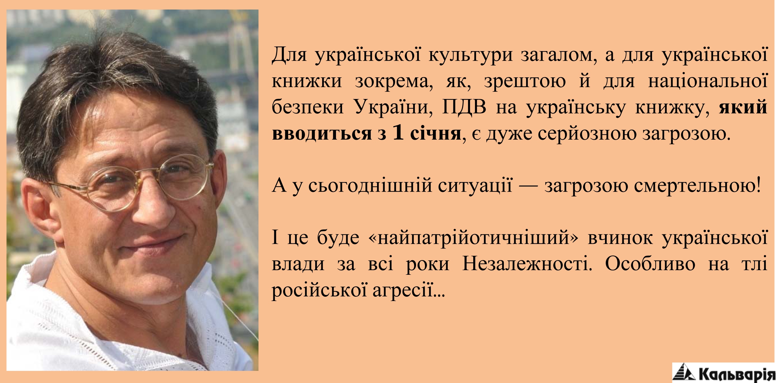 Для української культури загалом, а для української книжки зокрема, як, зрештою й для національної безпеки України, ПДВ на українську книжку, який вводиться з 1 січня, є дуже серйозною загрозою. А у сьогоднішній ситуації — загрозою смертельною! І це буде «найпатрійотичніший» вчинок української влади за всі роки Незалежності. Особливо на тлі російської агресії...У Великій Британії, яка є світовою книжковою метрополією, ПДВ на книжку ніколи не було. У більшості країн Європи ставки ПДВ на книжку або нульові, або символічні (3-7%). А введення ПДВ на книжку (хай і за пільговими ставками) там, де його не було, одразу викликає низку проблем навіть у країнах з добре розвиненим і захищеним книжковим ринком. Лише один приклад з Росії. Одним з результатів введення в Росії ПДВ на книжку за ставкою у 10% стало її трьохкратне (!) подорожчання для покупця й суттєве зменшення надходжень до бюджету